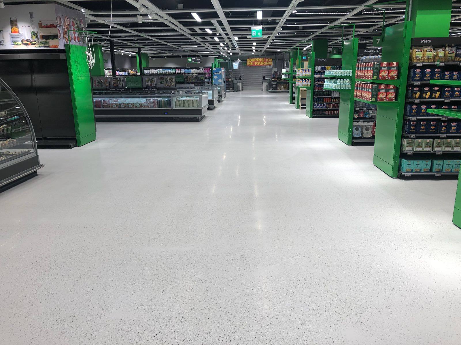 It gives almost infinite design possibilities, without compromising the quality.It is possible to make joint-free and crack-free floors in very large areas and play with the Color,size and quantities of the aggregates. Logos and inserts can be put into the floor and all these options can be combined.